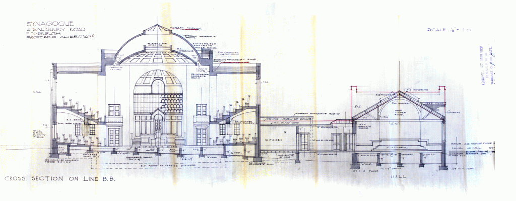 The Salisbury Road Synagogue was consecrated by Chief Rabbi Joseph Hertz with the Lord Provost, magistrates, professors from the University of Edinburgh, Members of Parliament, every member of Edinburgh Council and over 1,400 people present. This first and only purpose-built synagogue in Edinburgh accommodated 1,500 people and marked the coming together of the two main faction-riven congregations in the city. The new building demonstrates the social upward mobility of community members, the majority by this time located in the south Edinburgh suburbs. It also marks the physical move away from the “Jewish Quarter” around Nicolson Street, Richmond Street, and The Pleasance. By 1932 this was the only synagogue in Edinburgh and remains so to this day. As shown in the section drawing of the synagogue, a number of elements, such as the double walled dome, were not included in the final building due to cost. |